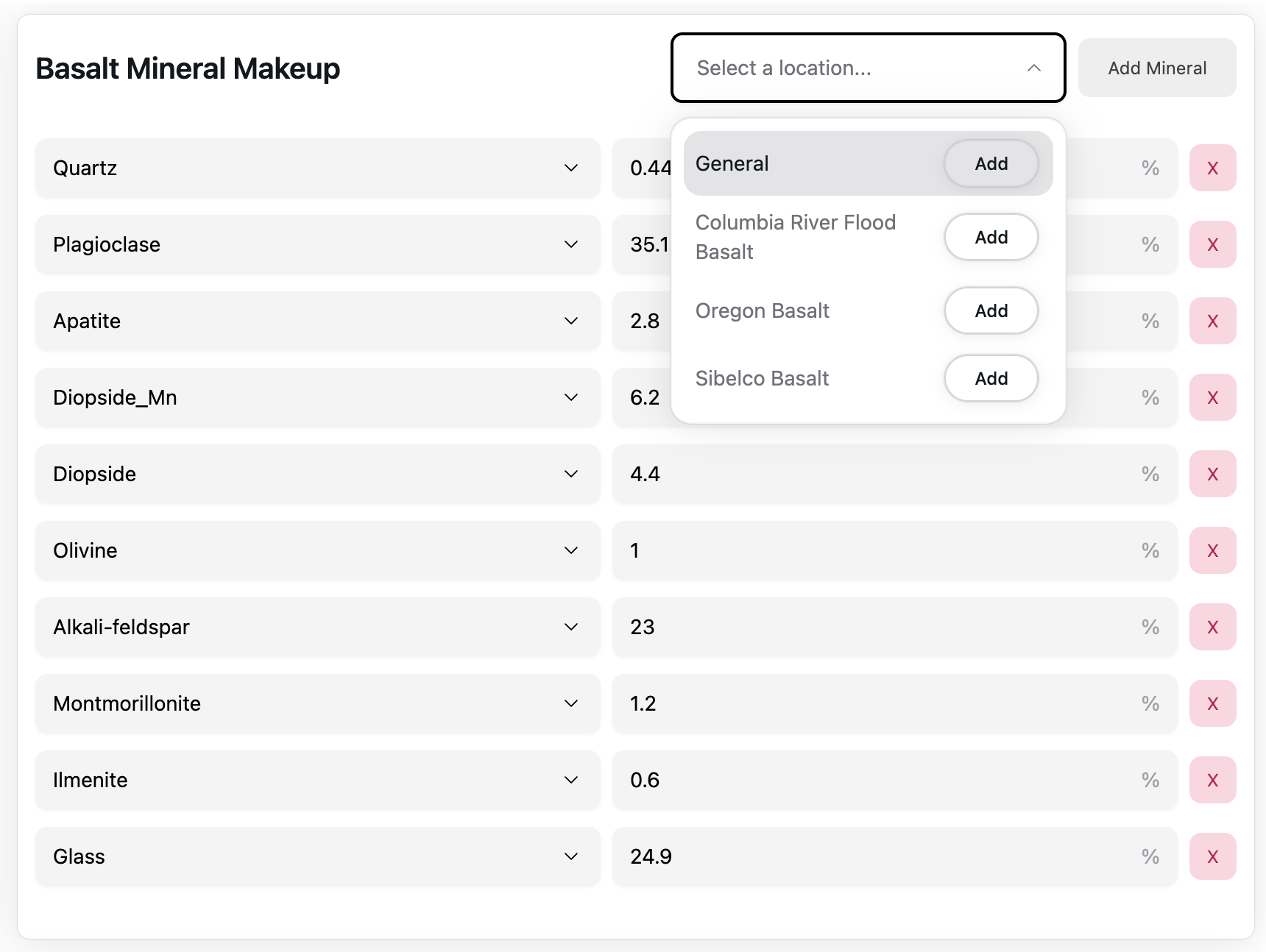 The tool allows users to select a location from a predefined list, which updates the basalt mineral composition accordingly. Locations represent different basaltic formations that exhibit variations in mineralogy due to differing geological histories and formation conditions. Examples include: