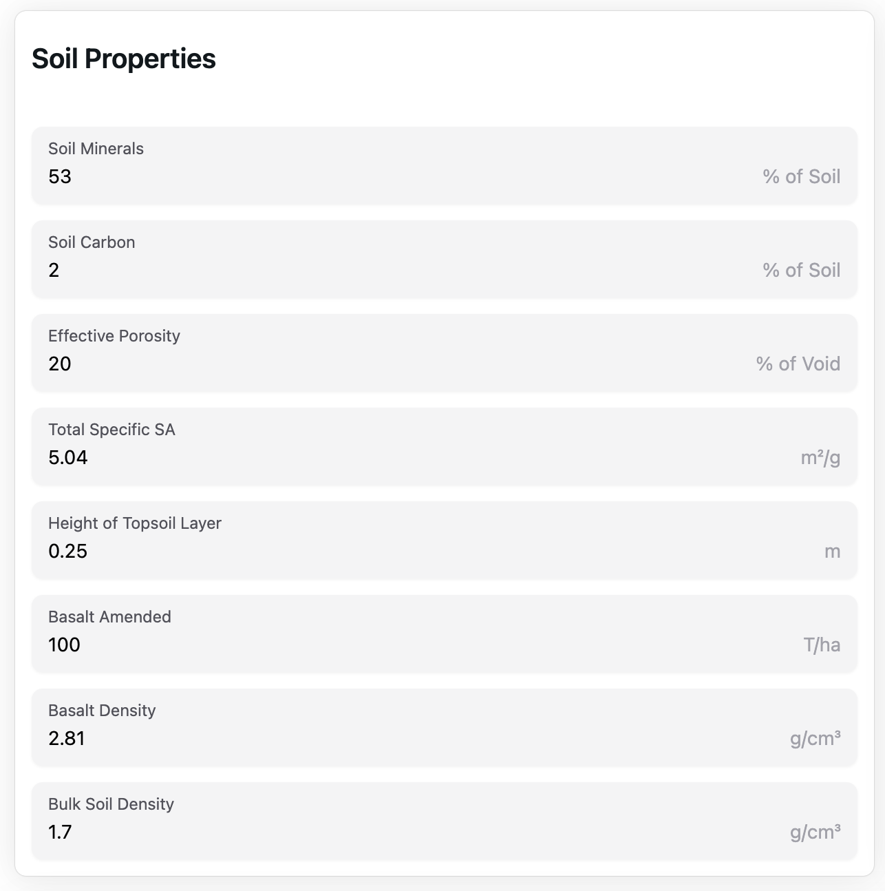 This section documents the parameters and assumptions behind the soil property inputs that govern the simulation of geochemical interactions. These properties play a key role in determining the dissolution kinetics of basaltic minerals, cation release, secondary mineral formation, and the subsequent sequestration of CO₂ via carbonate precipitation and bicarbonate transport. The following definitions provide clarity on how each parameter is assumed and modeled.